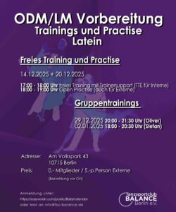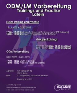 Ein Blick auf den Kalender verrät uns, dass die bevorstehenden Ostdeutschen und Berliner Latein Meisterschaften nicht mehr weit weg sind. Bereits am 10./11.01.26 finden die ersten Meisterschaften in Dresden statt! Folgende Termine im Balance sind zusätzlich für eine optimale Vorbereitung der startenden Paare geplant: