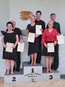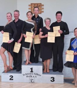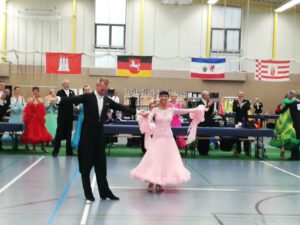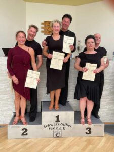 Peggy und Dietmar haben in Halle ihr erstes Standard Turnier getanzt. Während es in der Masters II D-Standard „nur“ der 8. Platz, erreichten sie in der Masters III D-Standard bereits das Finale, wo sie den 6. Platz erzielten. Eine ordentliche Premiere, wenn man bedenkt, wie kurz die beiden erst Standard trainieren. Wir sind gespannt, wie Eure 10-Tänze (ok, z.Z. eigentlich nur 7 Tänze) Karriere so weiter geht!