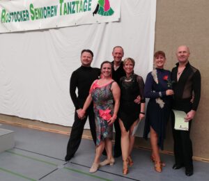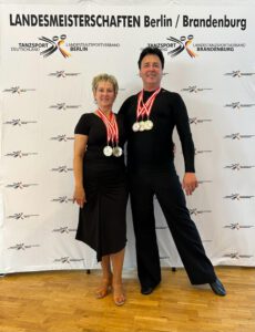 Monika und Jörg starteten das erste Mal gemeinsam in der Masters III S-Latein. Leider war die Vorbereitungen vor der LM durch gesundheitliche Probleme beeinträchtig, so dass die LM Teilnahme auf der Kippe stand. Beide wollten aber unbedingt an der LM teilnehmen und so „bissen sie die Zähne zusammen“. Noch sehr nervös in der Sichtungsrunde, steigerten sie sich im Finale, wo sie noch ein Berliner Paar hinter sich lassen konnten. Insgesamt holten sie aus Berliner Sicht den 3. Platz und damit die Bronzemedaille. Auch wichtig: Die Erstplatzierten sind in diesem Jahr in der Masters III bereits international durchgestartet und haben damit die Messlatte in Berlin sehr hoch gesetzt.