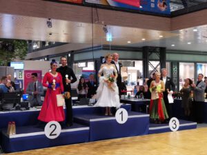 Besser lief es bei Doris und Karsten, die nach einer Vorrunde, das Finale der Masters II A-Latein erreichten. Hier erzielten sie den 3. Platz. Prima! Die Lateinehrung musste im Standardoutfit entgegengenommen werden, da mal wieder alles sehr schnell gehen musste. Gerade noch Jive und Paso Doble und wenige Minuten später Langsamer Walzer… ?
