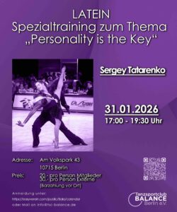 | 01/26 | 31.01.2026 | 17:00-19:30 | Latein | Sergey Tatarenko | Spezialtraining zum Thema „Personality is the Key“ | 20,- | 30,- |
